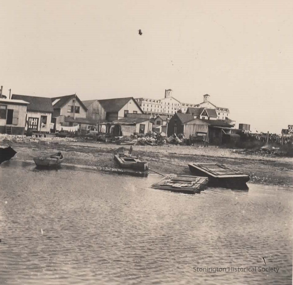 Black and white snapshot, "Shore at Watch Hill at the turn of the century, looking shoreward from Watch Hill docks. Larkin House in rear." Late 1800s.