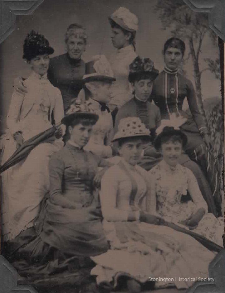 Tintype, "Top: Jennie Trumbull, Mrs. Helen Nellie Trumbull, Molly Robinson (dau. Henry Robinson), Sarah Holes, center: Lizzie Robinson (dau. Henry Robinson), Maria B. Trumbull, lower: Annie (dau. Rev. C.J. Hill), Elise Holmes, Louise Trumbull."