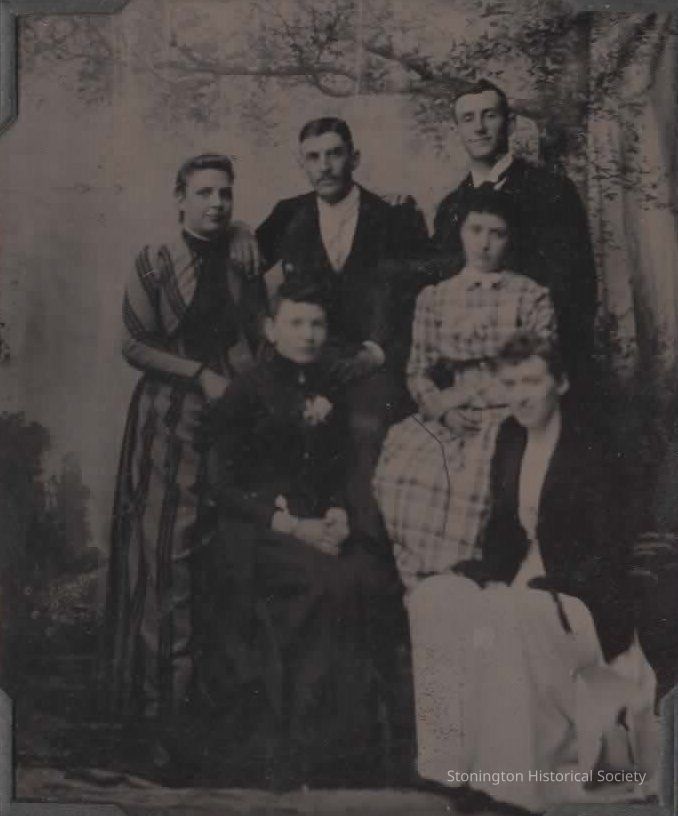 Tintype, "upper row: Carrie Hammond (Mrs. Carl Koelb), Charles O.B. Hammond, Harrie Lee, center couple: Grace Wilcox (Mrs. Charles Hammond), Alice Chesebro (Mrs. Harrie Lee), adopted daughter of Mrs. Dudley Chesebro, lower rightm, taken about 1890."