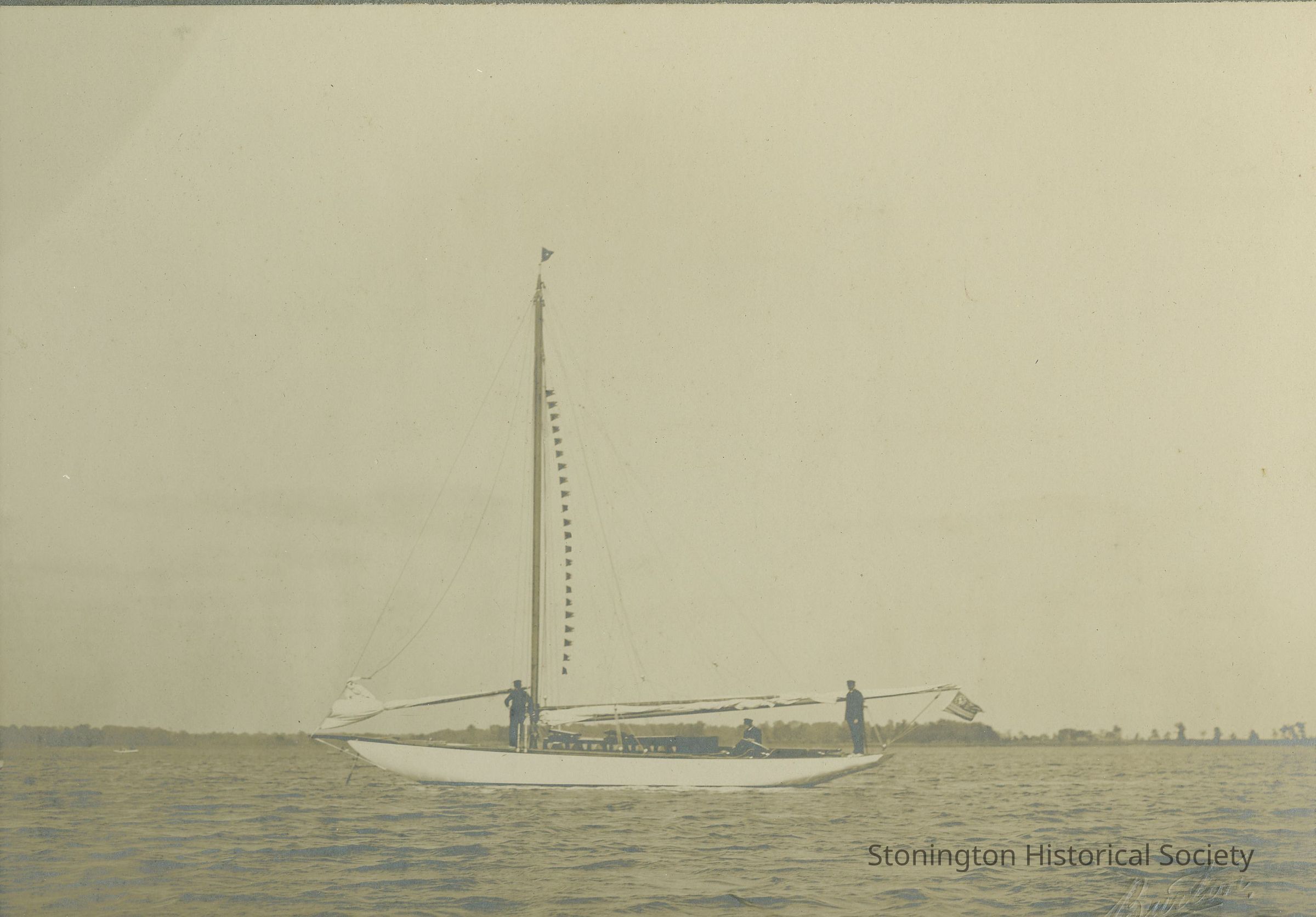 on back: "This photograph of the Sloop ADELAIDE of the New York Yacht Club, One Design 30 foot Class is presented by her owners: G. A. and P. H. Adee, to Mrs. Elizabeth D. Loper, whose father and brothers taught the "skipper of the ADELAIDE, in bye gone days, nearly all he ever knew about sailing. Stonington CT, August 2nd, 1908"