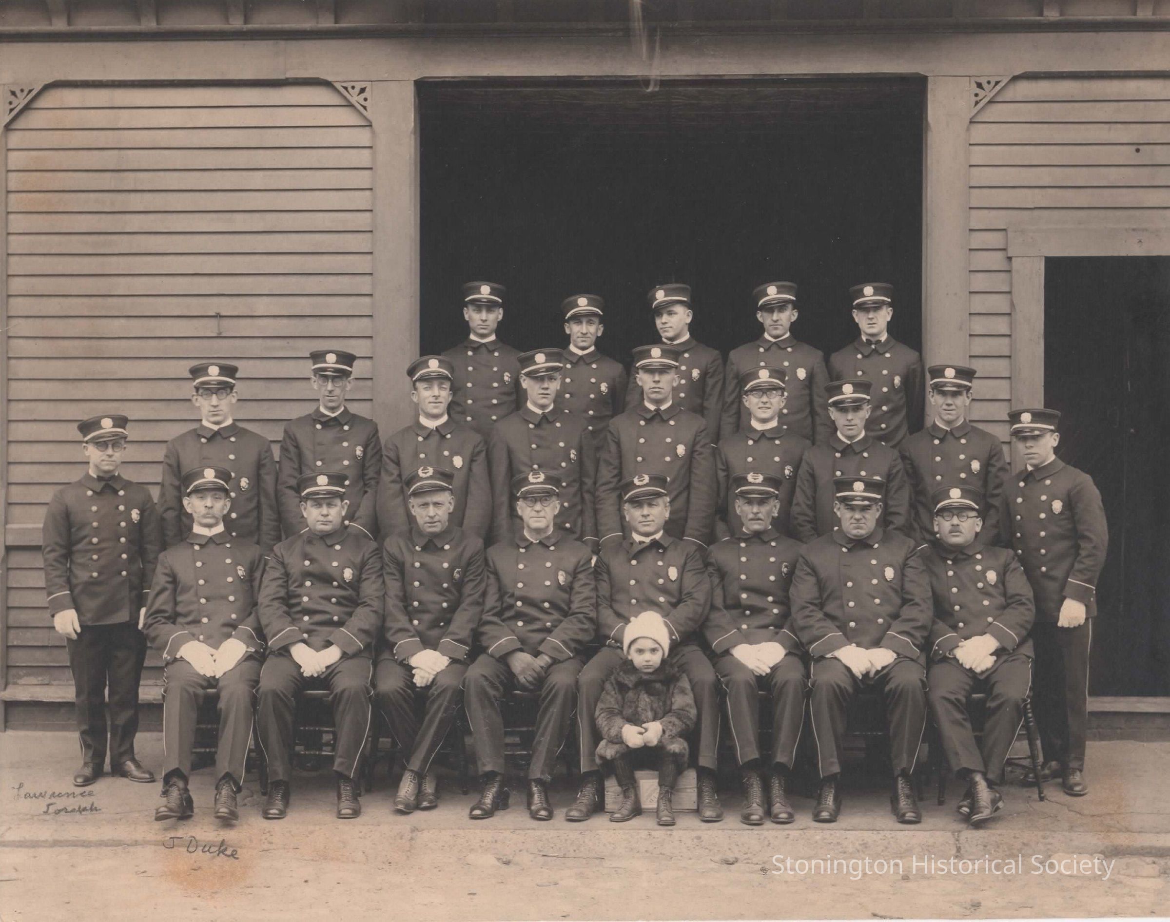 Photograph, "Pioneer Hook and Ladder Company." Handwritten identifications on photograph for "J. Duke and Lawrence Joseph."