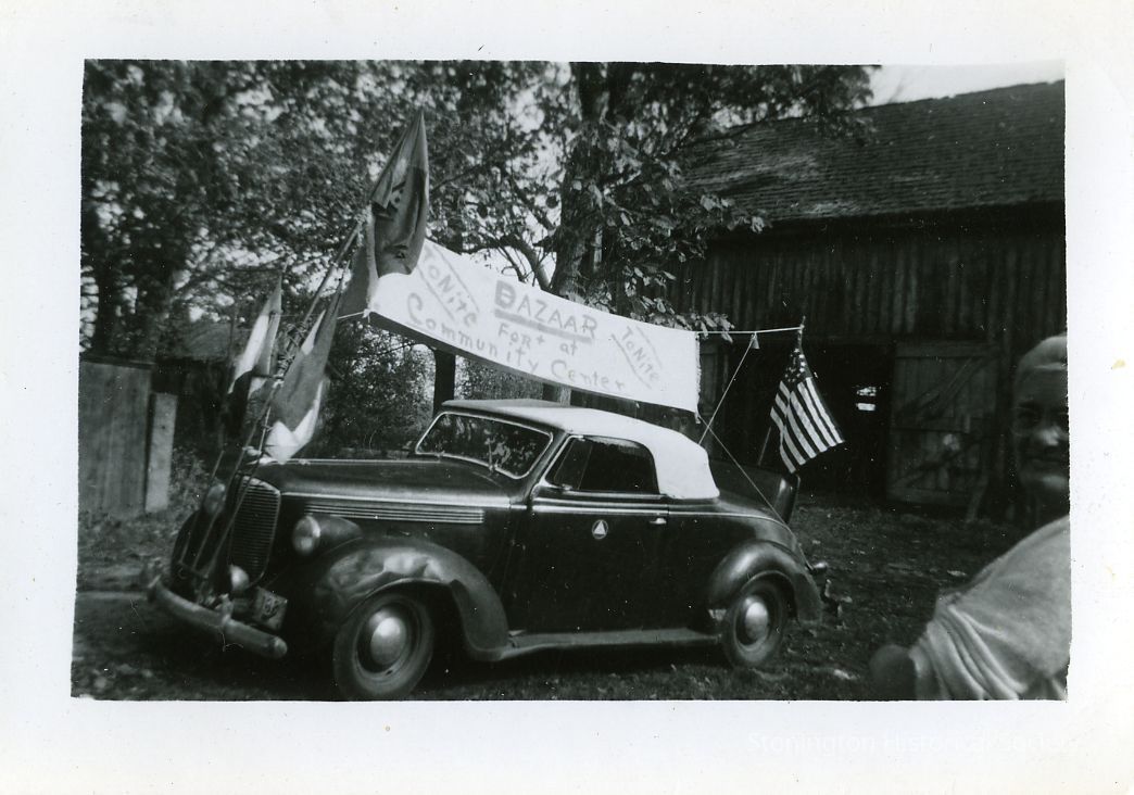Black and white photograph of car decorated for Bazaar in Tulsa OK(?)