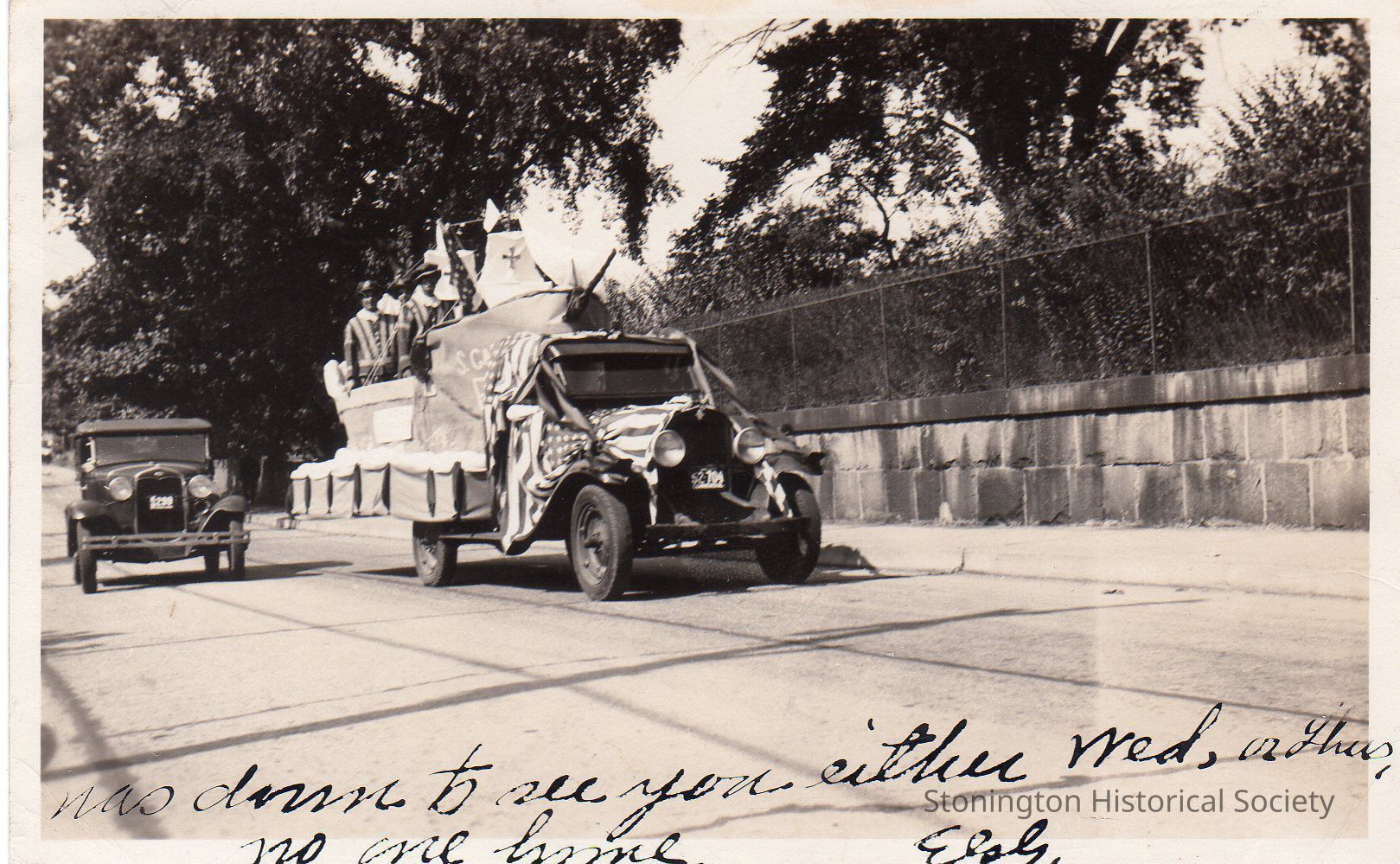 Postcard, photograph from the celebration of the Battle of Stonington Tricentennial, 1914. Tricentennial parade through Stonington Borough. Postmarked Nov. 19, 1915, addressed to Miss Barbara Muller.Collection