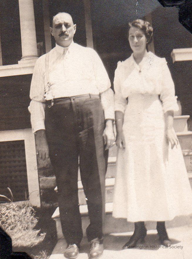 Photograph from the album, "The photographic life, moods and friends of Dorothea Hewett Gould, 1907-1942" (2002.0613.018). Dorothea's parents, Vera Tillotson and "the Capt.," at the Perry House, 1917. The Perry House was located on Main Street in Stonington Borough and was the place where shipyard officials and families boarded. "See that tiny waist!"Collection