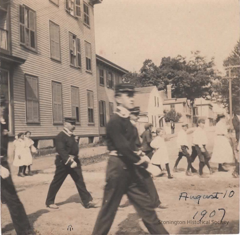 Photograph, members of the Steamer Fire Co. in uniform, marching in parade, August 10, 1907. Identified - Sam Wood and Jerome S. Anderson, Jr.