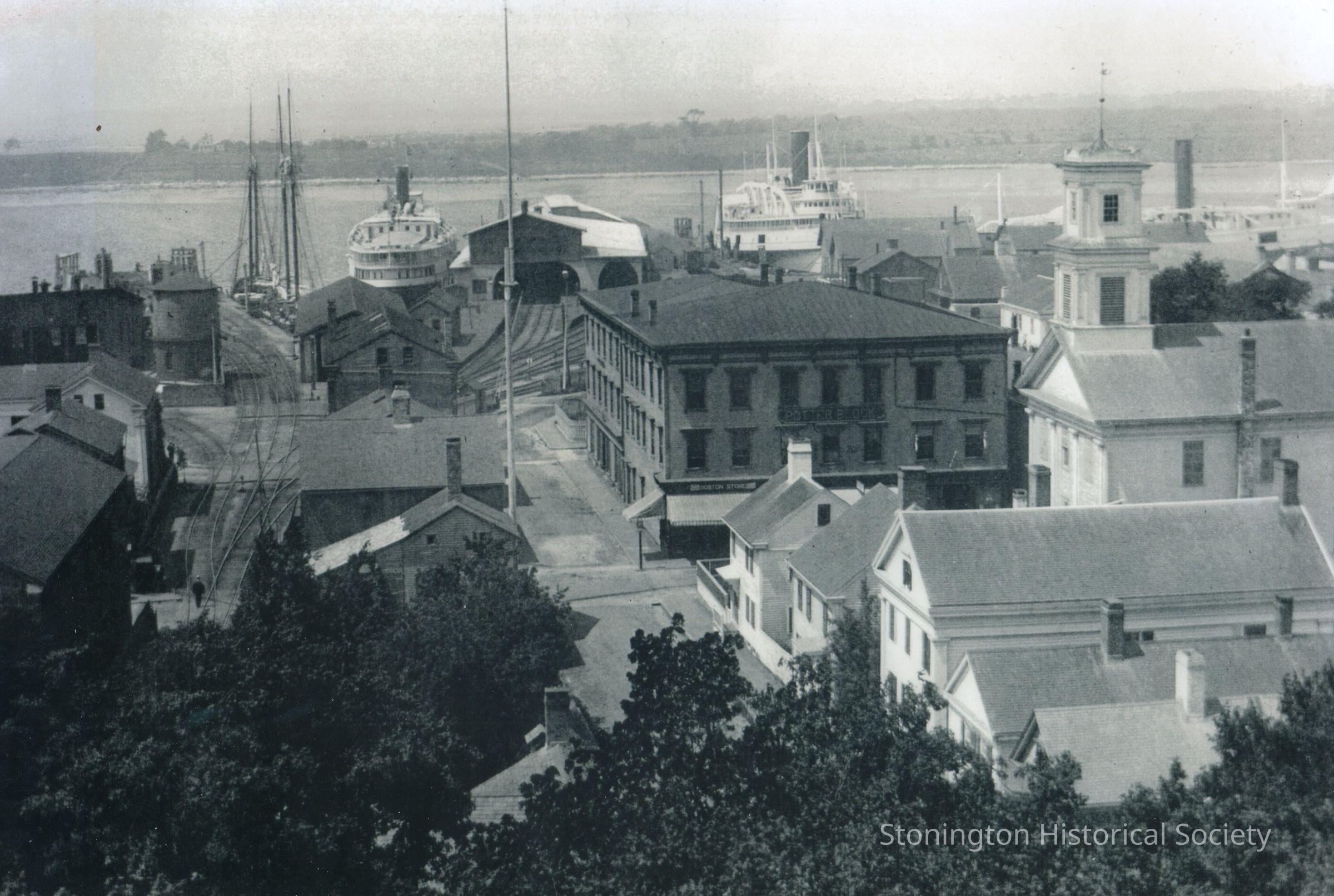 Black and white photo enlargement, aerial view of harbor facing west from Congregational Church tower showing rail tracks and ships at docks; First Baptist Church on right (Water Street behind Pearl Street) and Potter Block (corner of Water and Pearl Streets) visible. Given to the Society by Harry Northup before his death.Collection