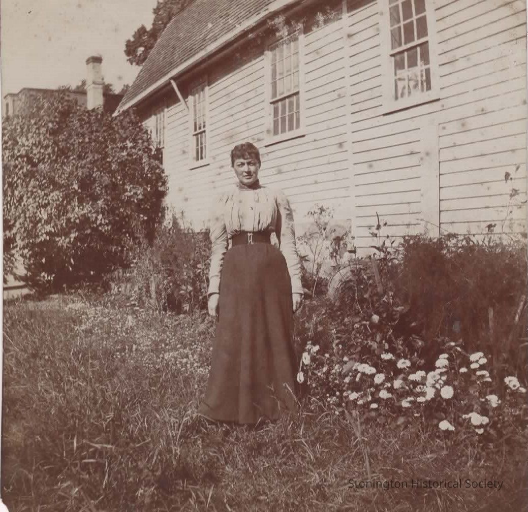 Photograph, "Mrs. Kate (Heydecker) Hahn, in garden, rear of Mary Howe House."