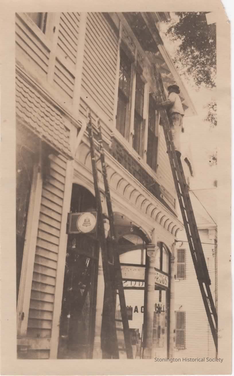 Photograph, "George E. Brayton painting Brayton's Drugstore." (c. 1940s?)