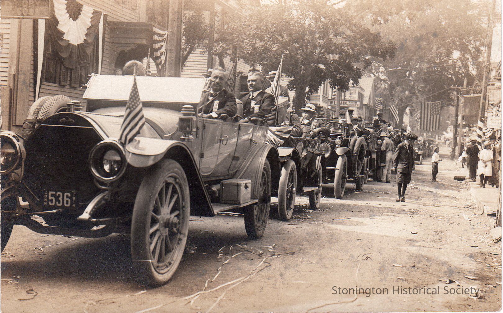 Postcard, black and white photograph of the Battle of 1814 Centennial Parade on Water Street in Stonington Borough, August 1914.Collection