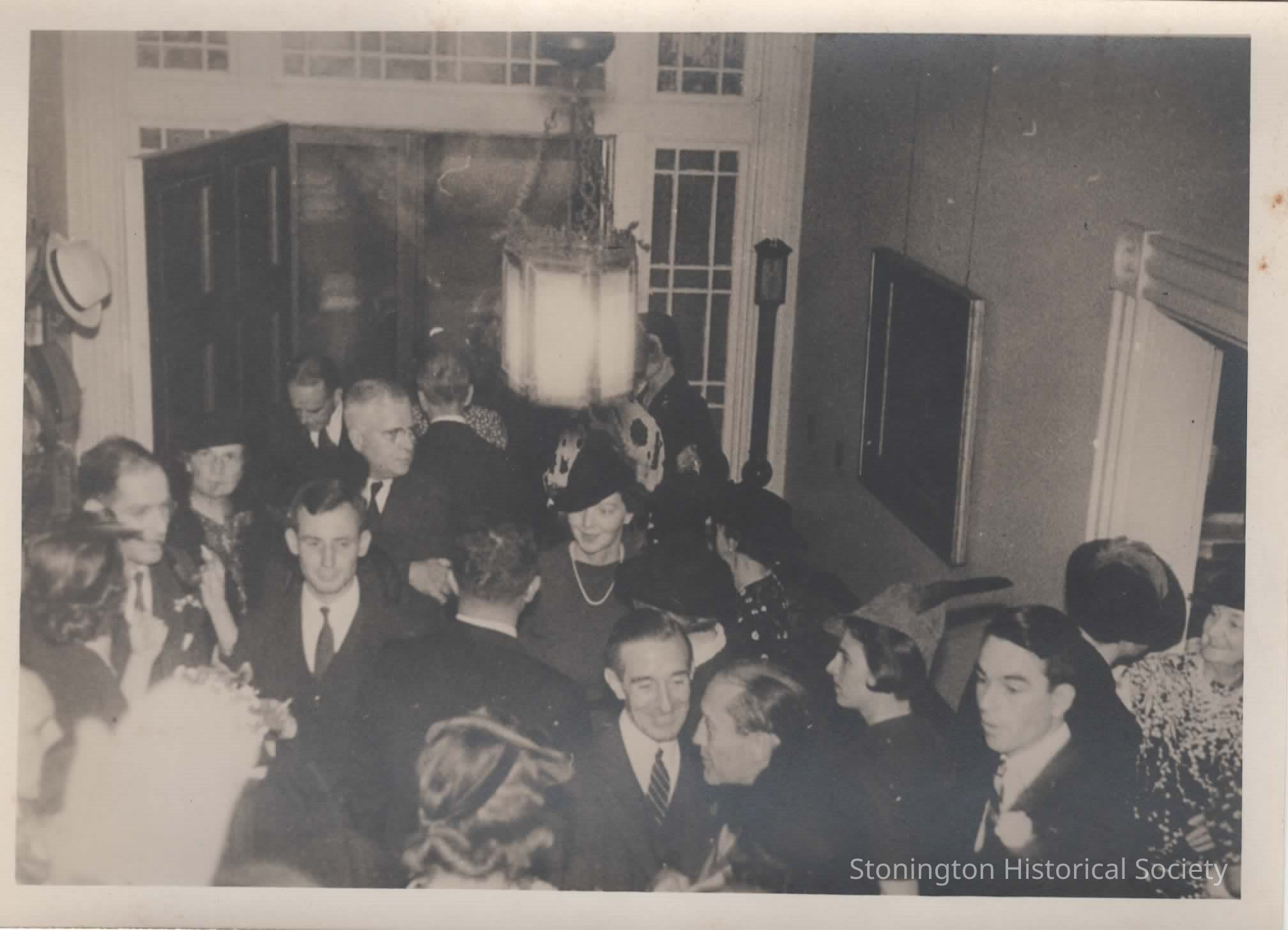 Black and white photograph, guests in the front hall at Stone Acres, arriving for the wedding reception of Jane Paffard and John Hamill, 1930s.Collection