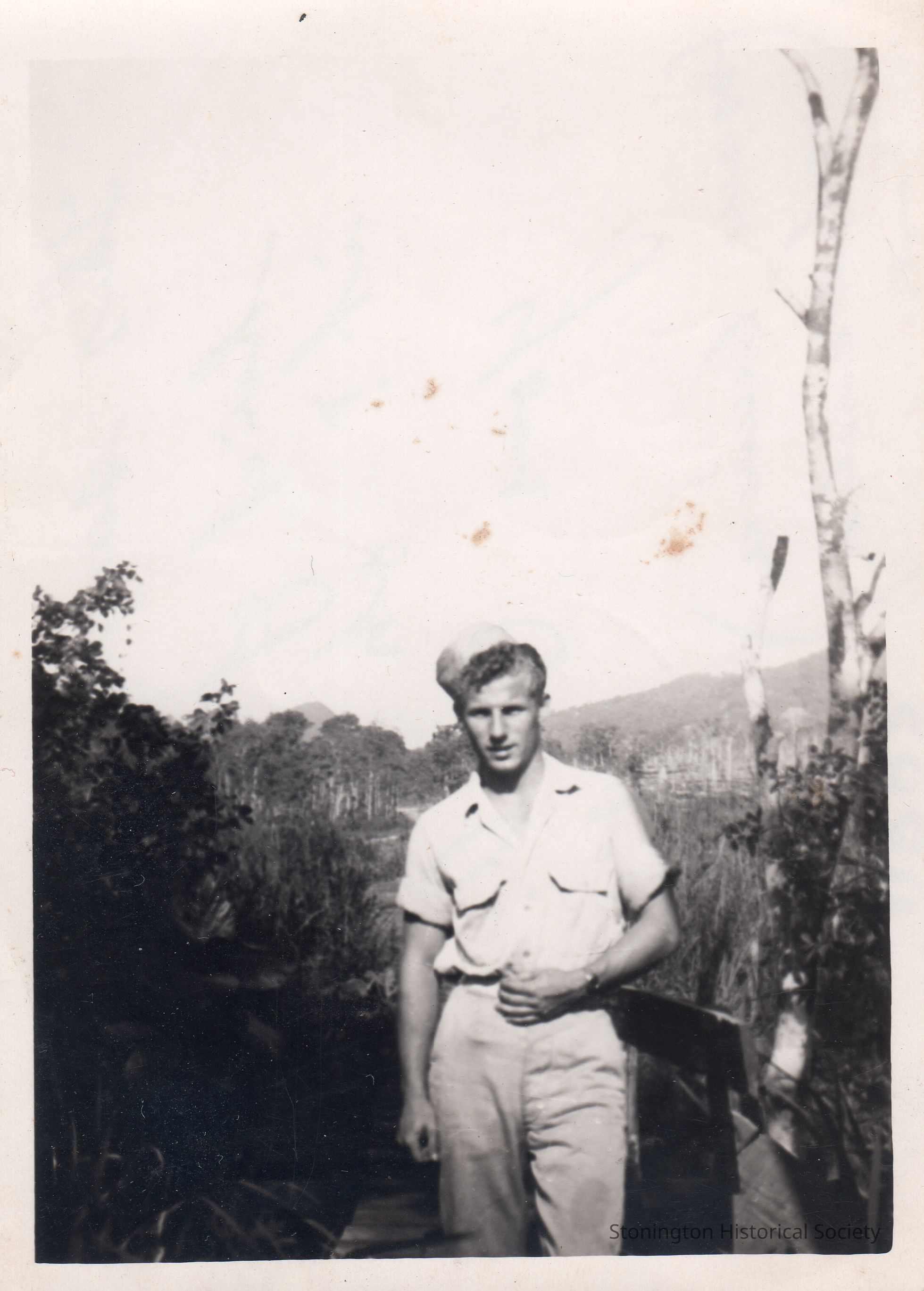 Black and white snapshot of an unidentified friend of Fred Weeks in uniform. Handwritten on the back: "This is suppose to be me. Kind of rough isn't it? Oh well. You Pal. H. (New Guinea, Hollandia)." Weeks was born in Stonington on March 16, 1922 and served with the U.S. Navy in the Pacific theater during WWII.