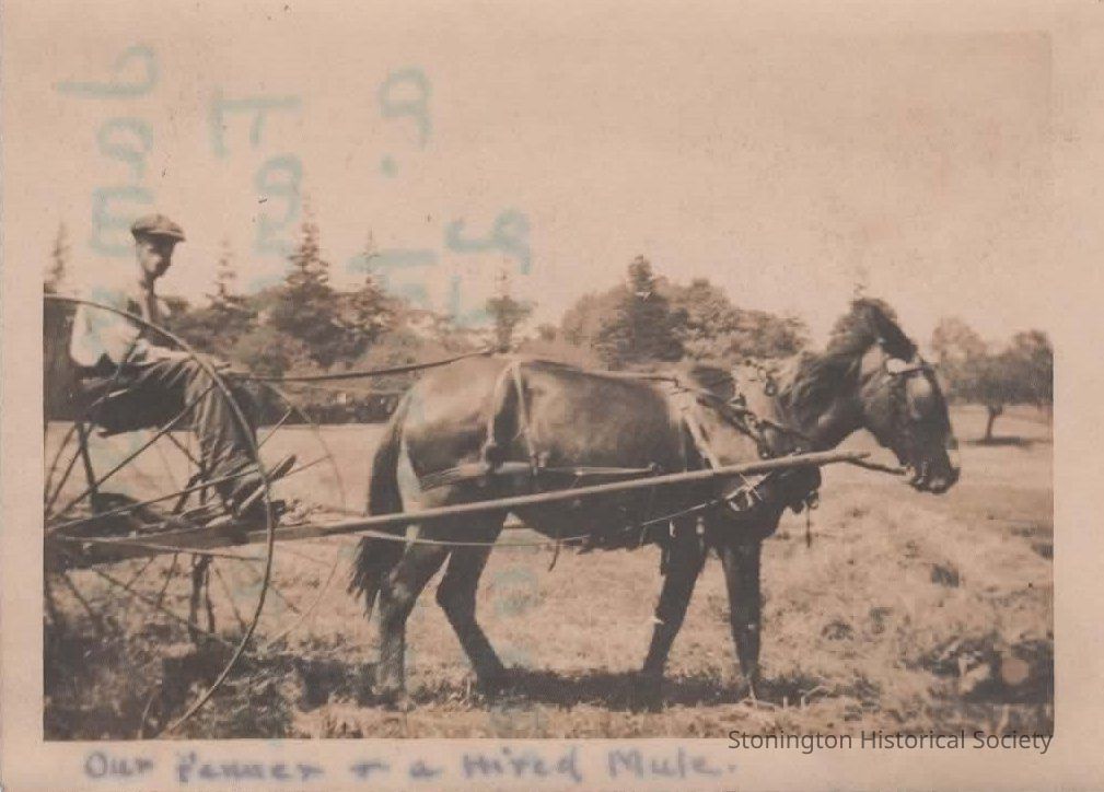black and white snapshot "Our farmer (James) and a hired mule", taken from the Helen Streeter Photograph Album, 1916Collection