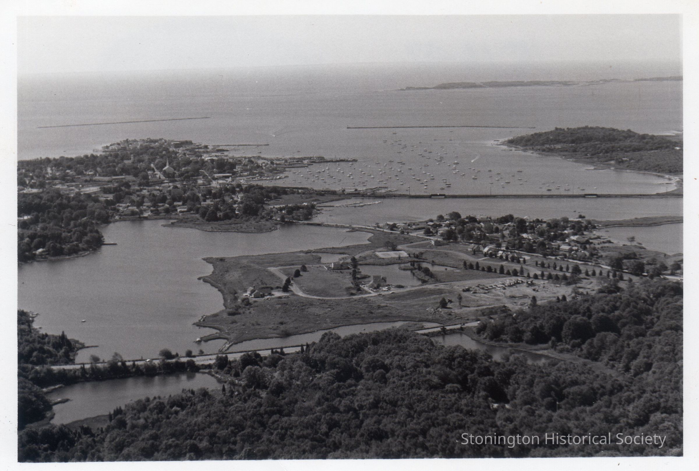 Black and white aerial photograph, Quanaduck Cove, Lambert's Cove and Stonington Borough.
