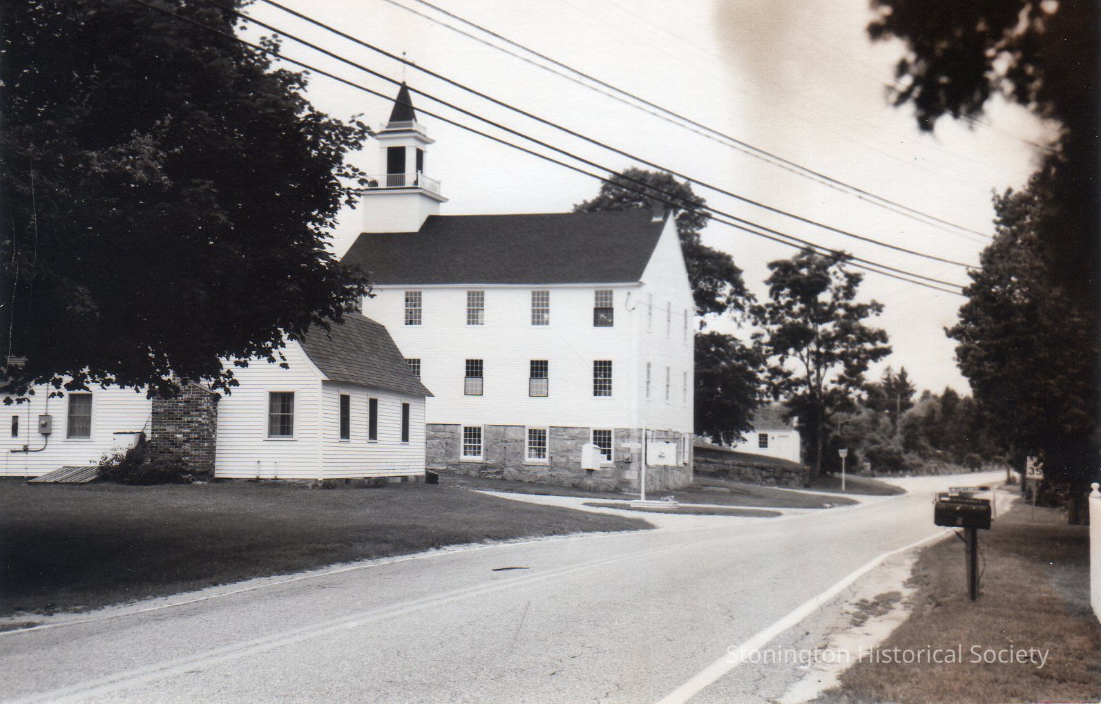 Black and white photograph postcard, Road Church and outbuildings on Pequot Trail. Photograph by Maurice LaGrua.