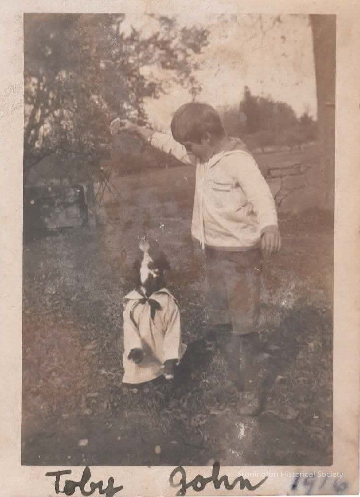 black and white snapshot, John Streeter with the family dog Toby, taken from the Helen Streeter Photograph Album, 1916-1917.Collection