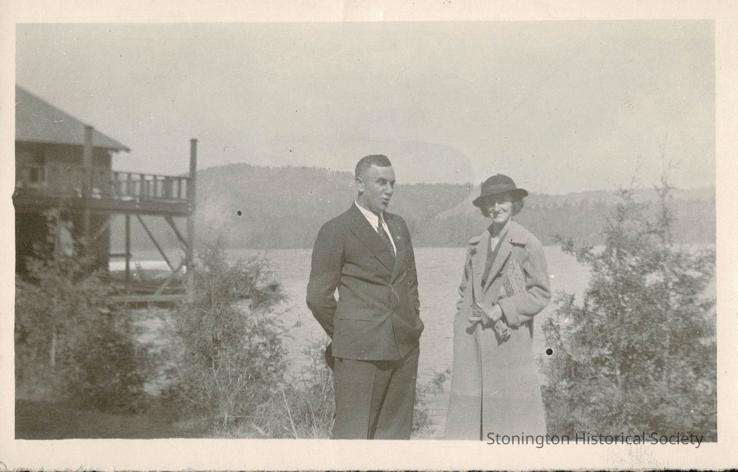 Black and white photograph of Burrows Perry (1897-1990) and his wife, Mildred Lanphear Perry (1896-1985), undated. Burrows and Mildred had three children: Martha (1921-1996), Andrew (1927-2014) and Ella (1931-2004). Burrows and Mildred were married in 1920. Photograph does not appear to be in Stonington.Collection