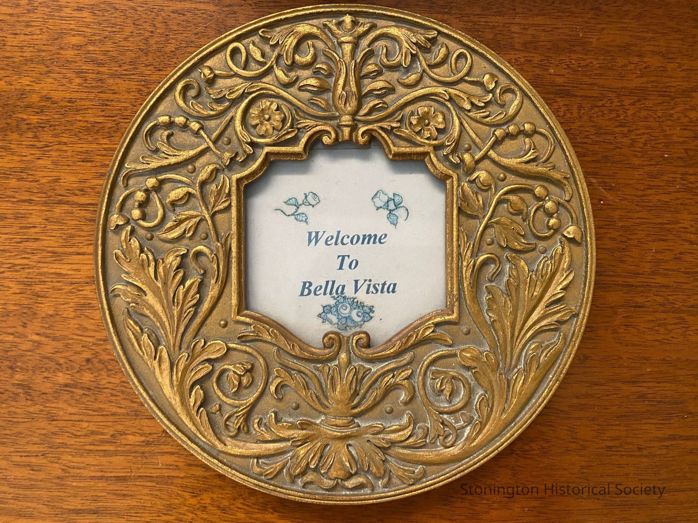 Small round frame with center display, "Welcome to Bella Vista". Bella Vista, 166 Elm Street, was built around 1901 by Edward E. Bradley. This little welcome sign was made by Rae Singer, owner of the house from 2000 to 2025.Collection
