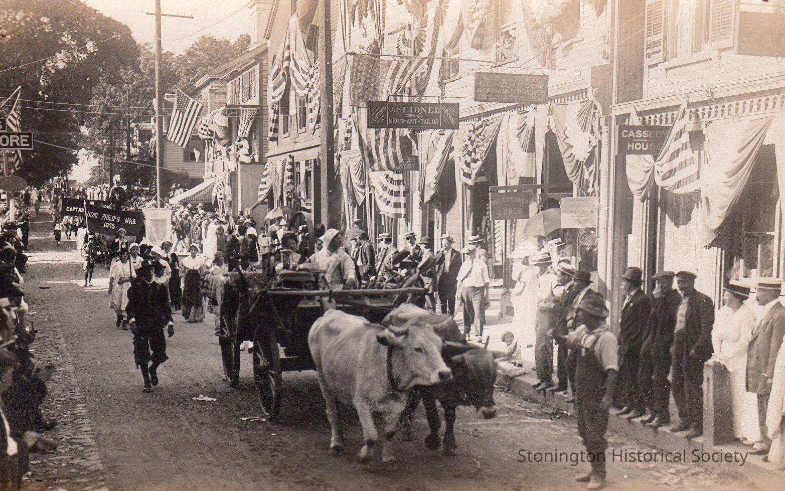 Postcard, black and white photograph of the Battle of 1814 Centennial Parade in Stonington Borough, August 1914.