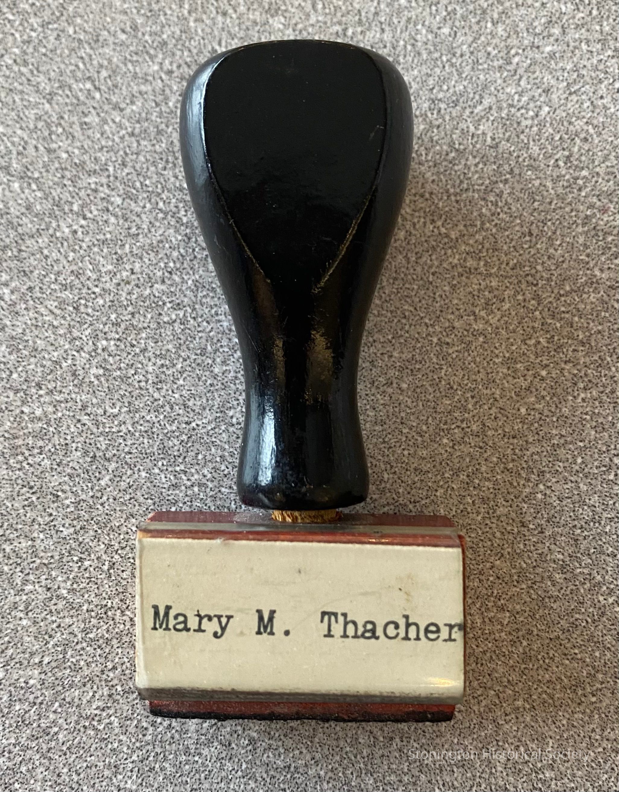 Rubber stamp, "Mary M. Thacher" that belonged to the former President of the Stonington Historical Society, Mary Thacher.
