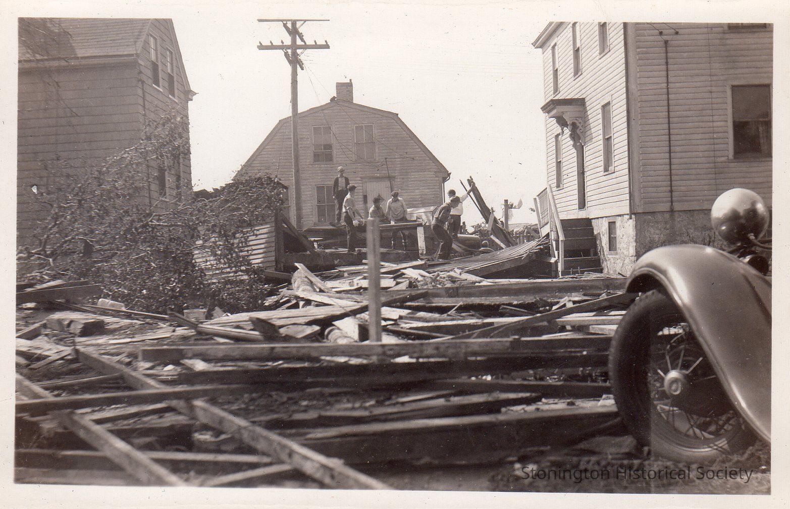 Black and white photograph of damage on Church from the 1938 Hurricane. From photograph album of Bertha D'Amico.