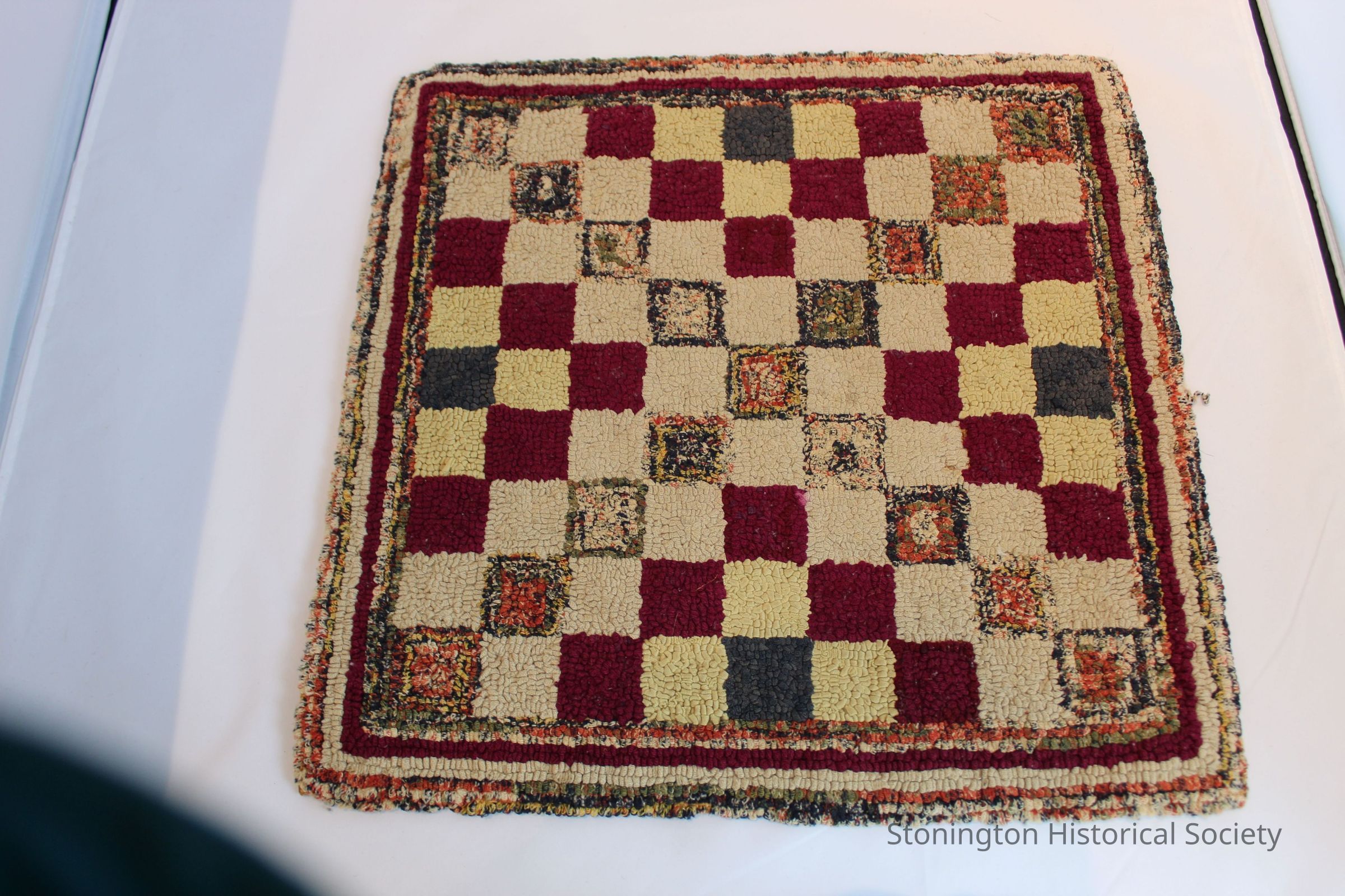 Square, checker board pattern hooked rug, made by Elizabeth "Marcie" Anne Coon Henson McShane. Backed in a chartreuse satin/rayon blend. Diagonal squares appear to have at one time had decorative images, but have been worn or removed due to age.Collection