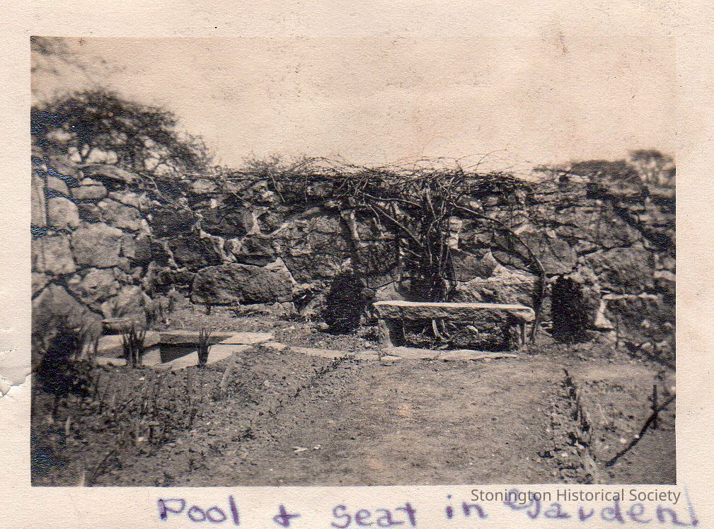black and white snapshot, "Pool and Seat in Garden" at the Streeter family home Red Brook, taken from the Helen Streeter Photograph Album, 1916-1917.Collection