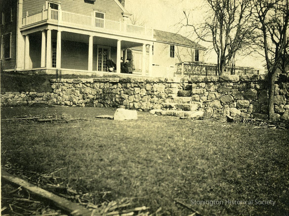 Covered porch at "The Hill" with stone wall on back a pencil drawing of house