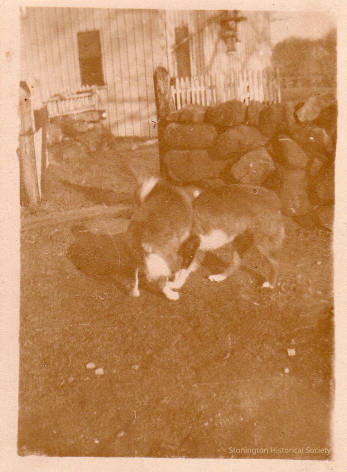 black and white snapshot, two dogs at the Streeter family home Red Brook, taken from the Helen Streeter Photograph Album, 1919.Collection