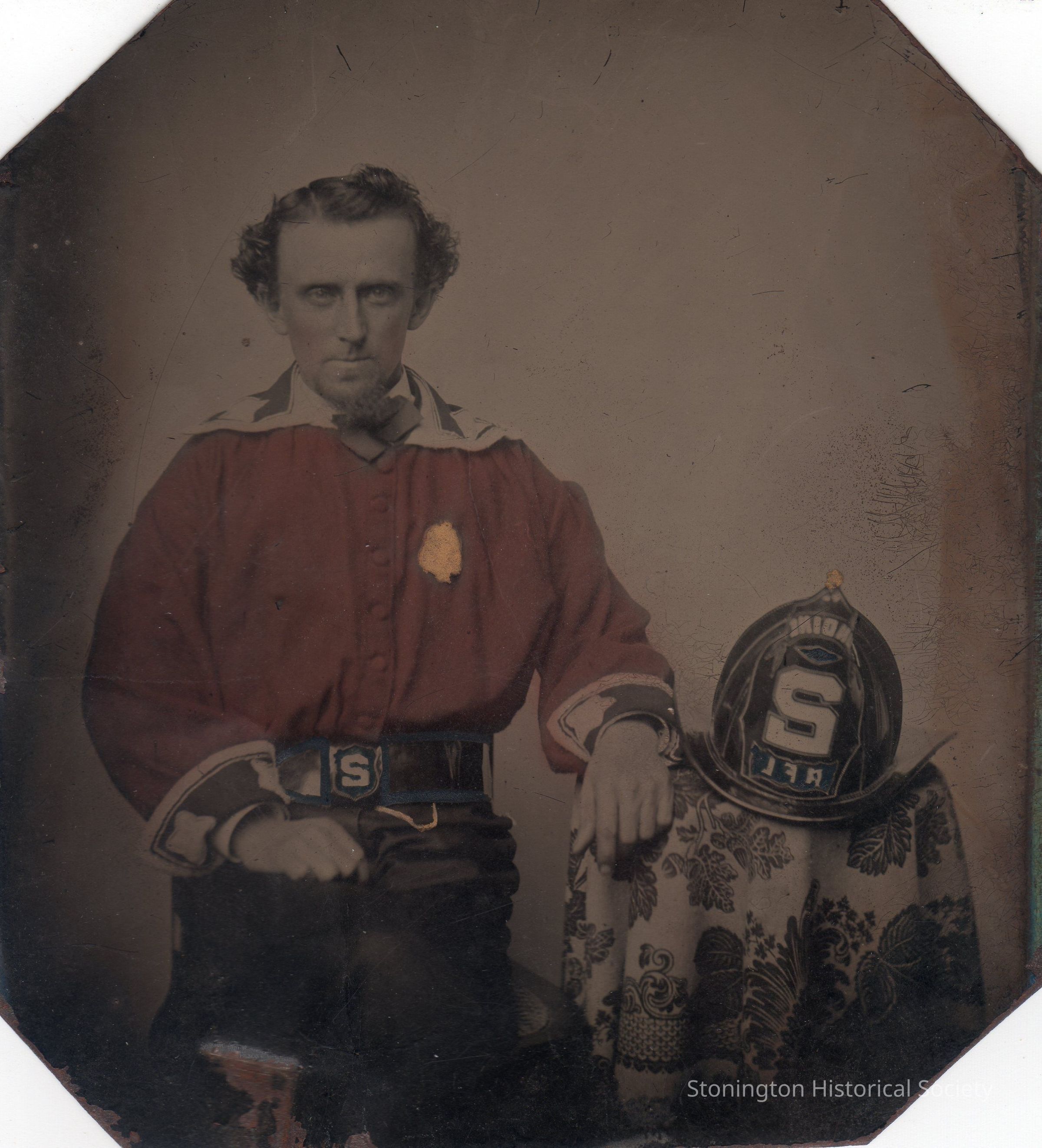 Tintype, colorized, Stonington firefighter in uniform. From collection of photographs of Stonington "Gentry."
