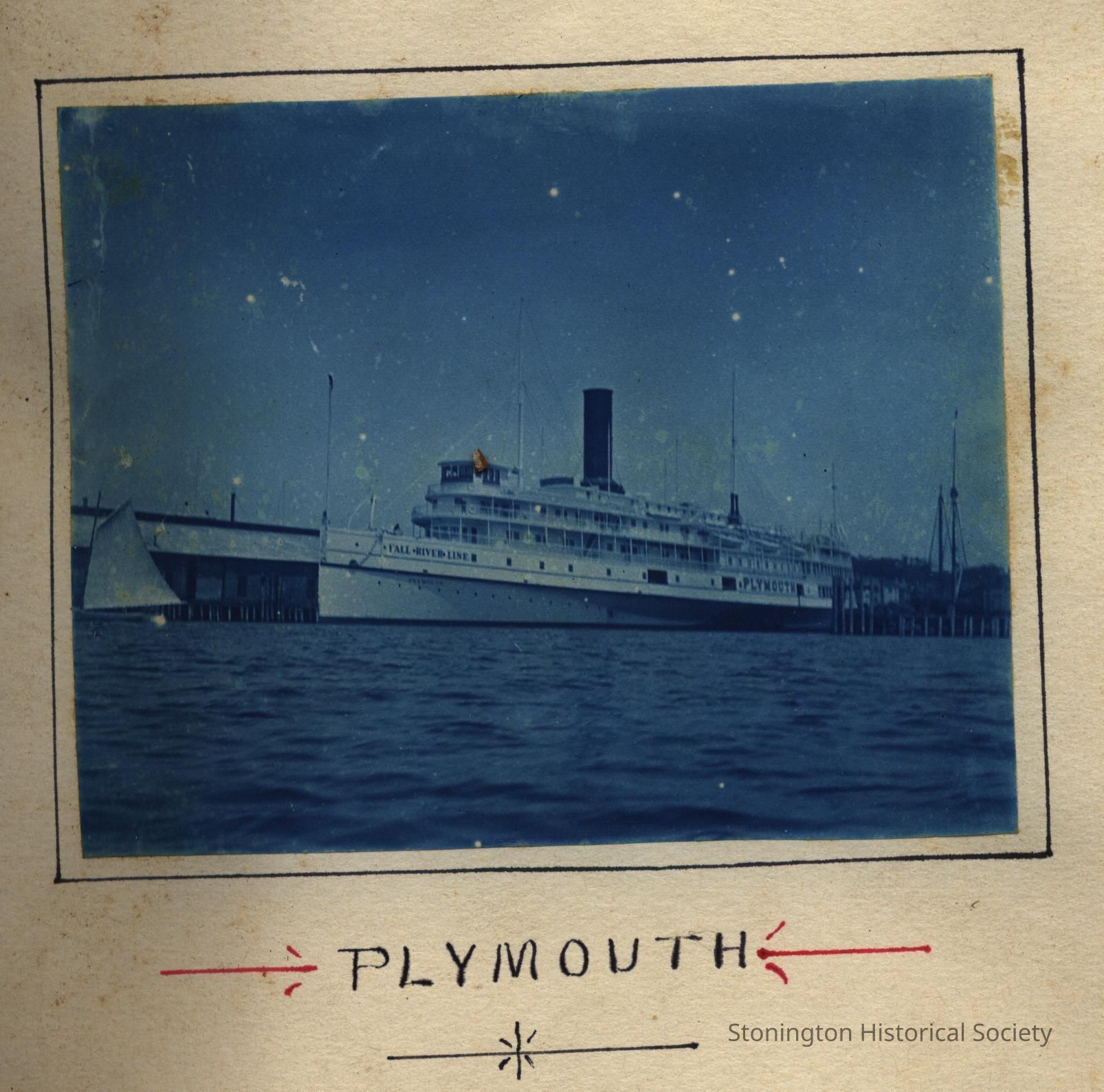 Cyanotype print of 'Plymouth" at dock with small sailing vessel on left side