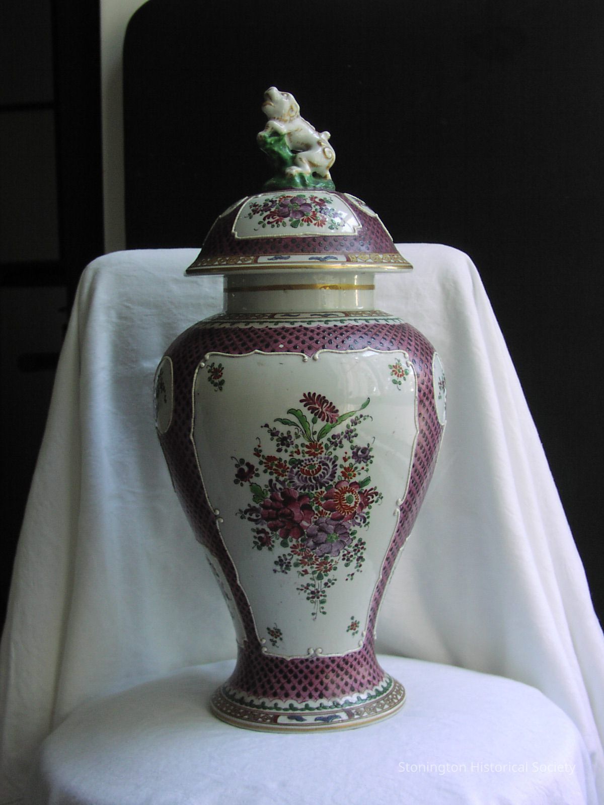 One of pair of French porcelain jars with lids in the Chinese mode. Gold borders, purple diaper pattern. On the sides are white panels with purple and red flowers in the center. Total of 6 panels; 2 larger ones on opposing sides and 4 smaller ones on opposing sides. The lid has Foo Dog knobs on the top with four white panels with flowers in them. At the bottom of the jar is a Asian looking mark. These are likely Samson & Cie, a French porcelain maker, 1810-mid-20th century.Collection
