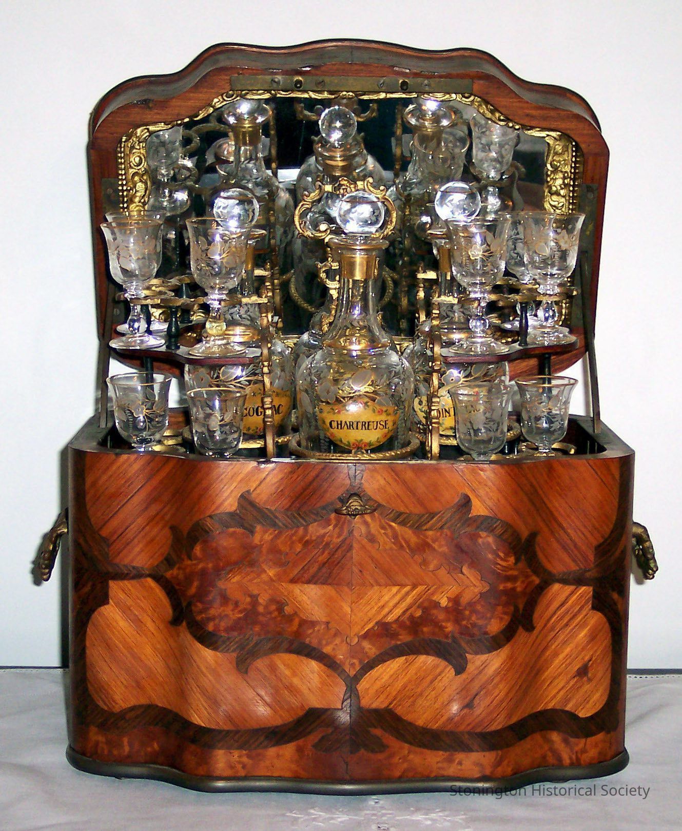 Tantalus (liquor cabinet) with 4 decanters & 11 (originally 16) glasses with gold decorations. Mirror in lid; key in lock, brass handles on each side. Rosewood, zebrawood & burl veneers; enamel labels on bottles: Cointreau, Cognac, Chartreuse, Benedictine. Top part of the box which holds the glass bottles and cups can be lifted off. Originally in the Whitehall collection.Collection