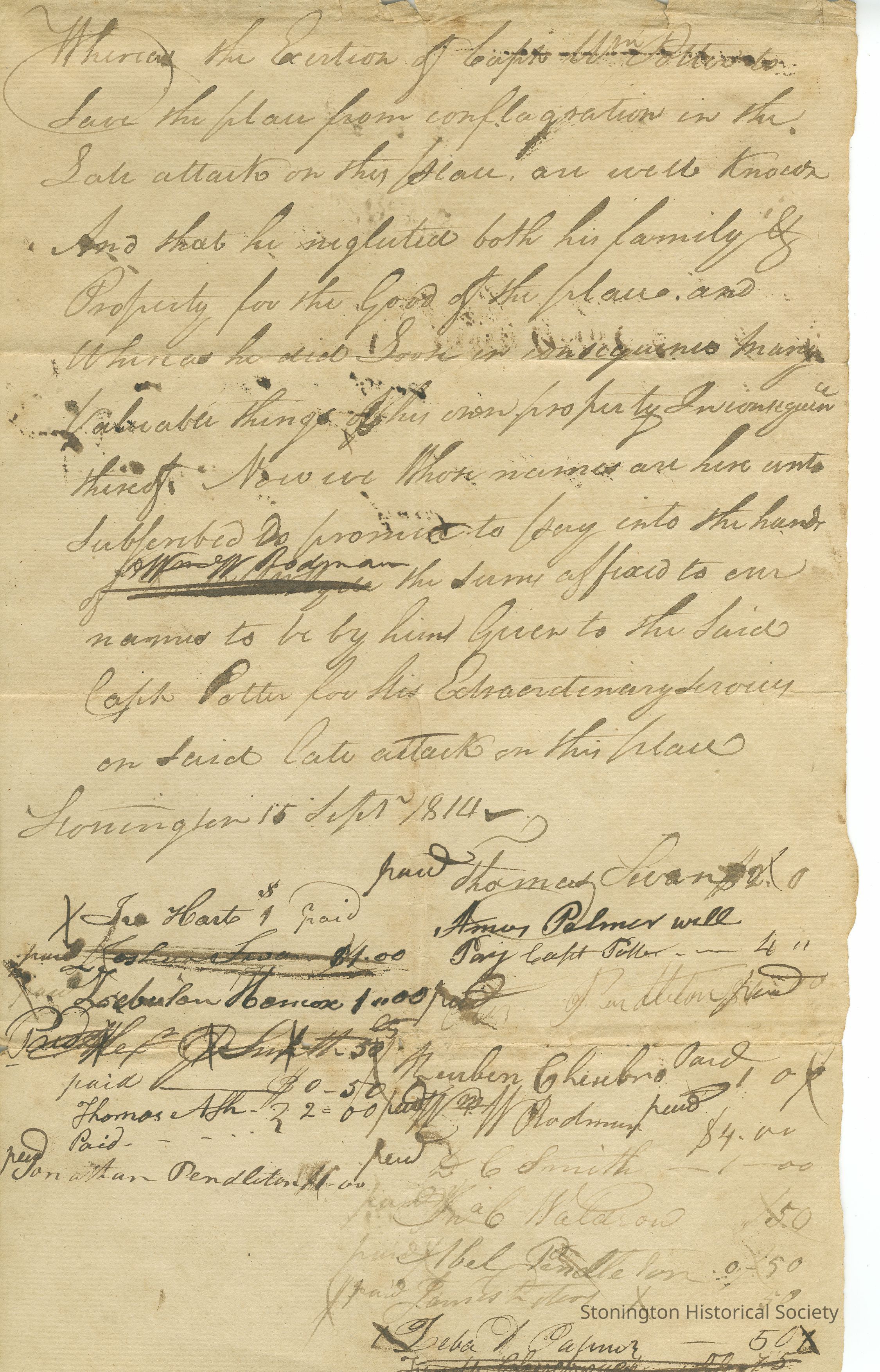September 15, 1814, letter promising to pay for extraordinary service rendered by Captain William Potter in saving Stonington