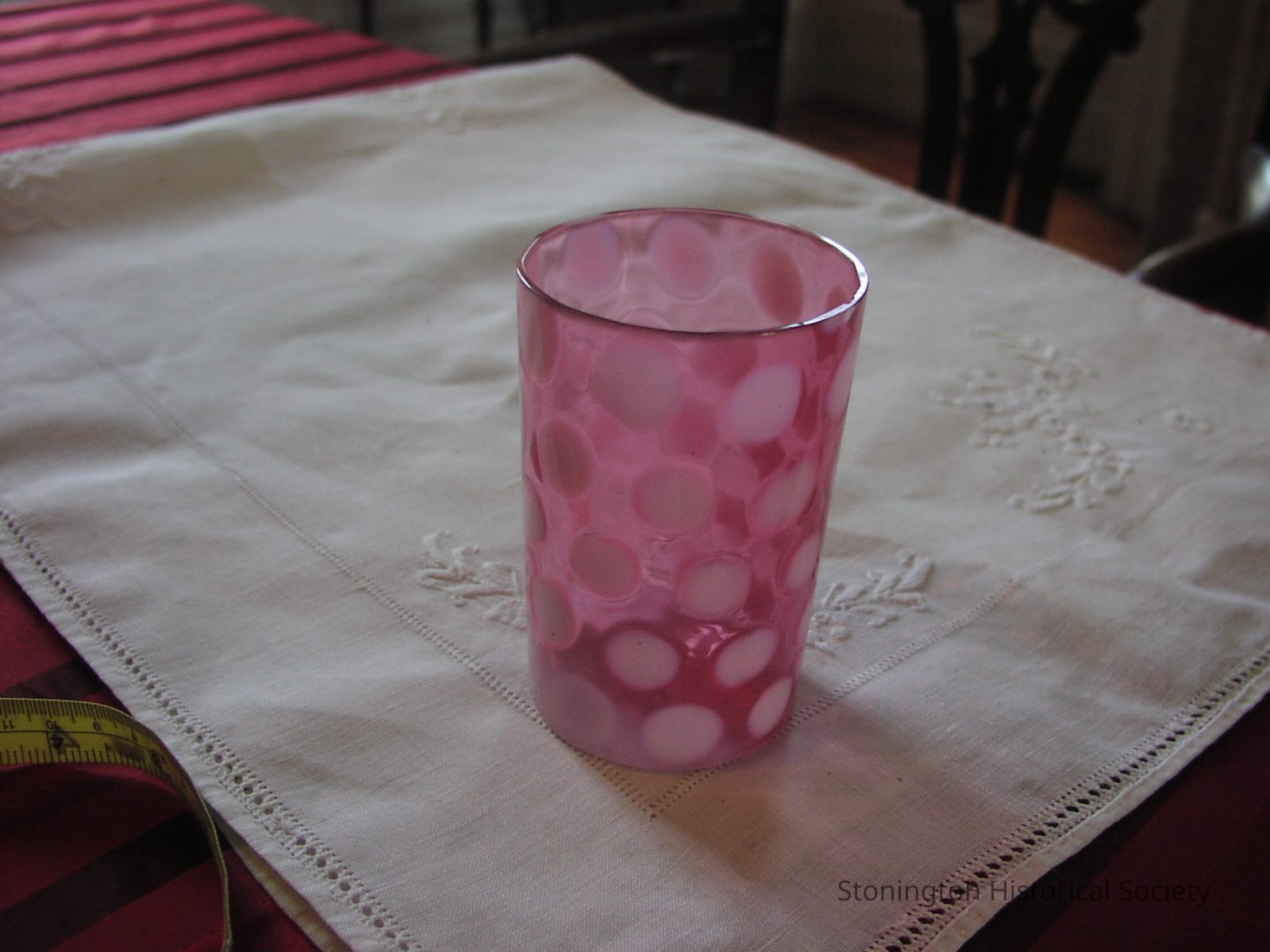 One of five; blown?, simple tumbler shape; cranberry -pink color with 4 or 5 rows of white spots - "coin print"
