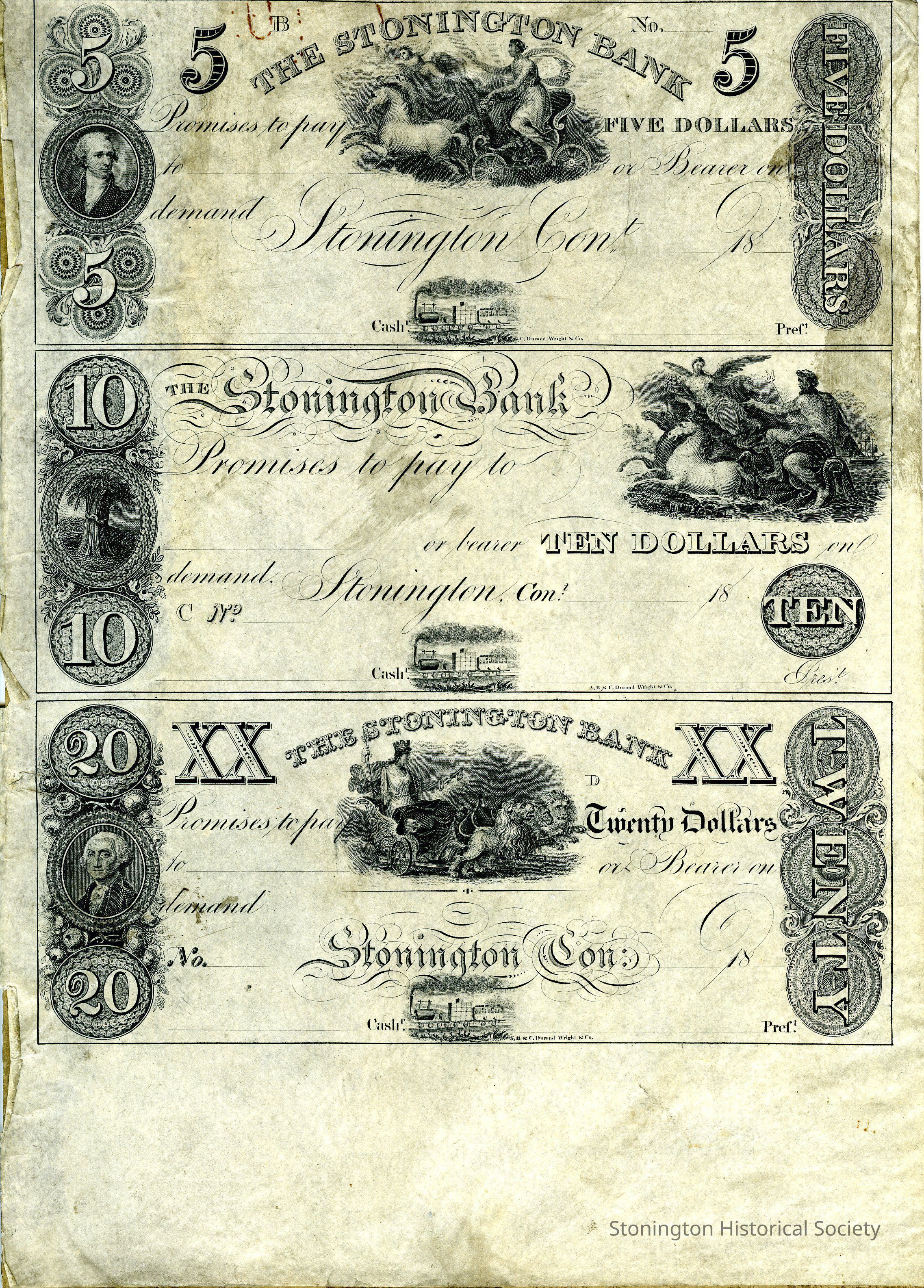 3 bank notes from Stonington Bank, $5.00, $10.00, $20.00