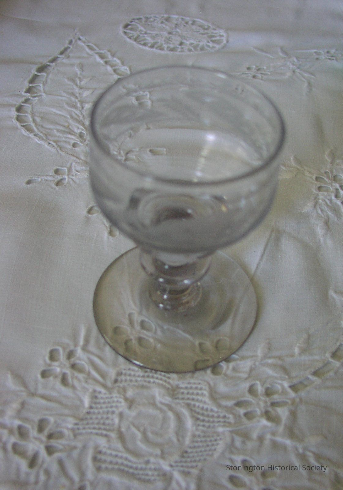 Blown glass cordial glass, one of six; etched leaves & paramecium around bowl.