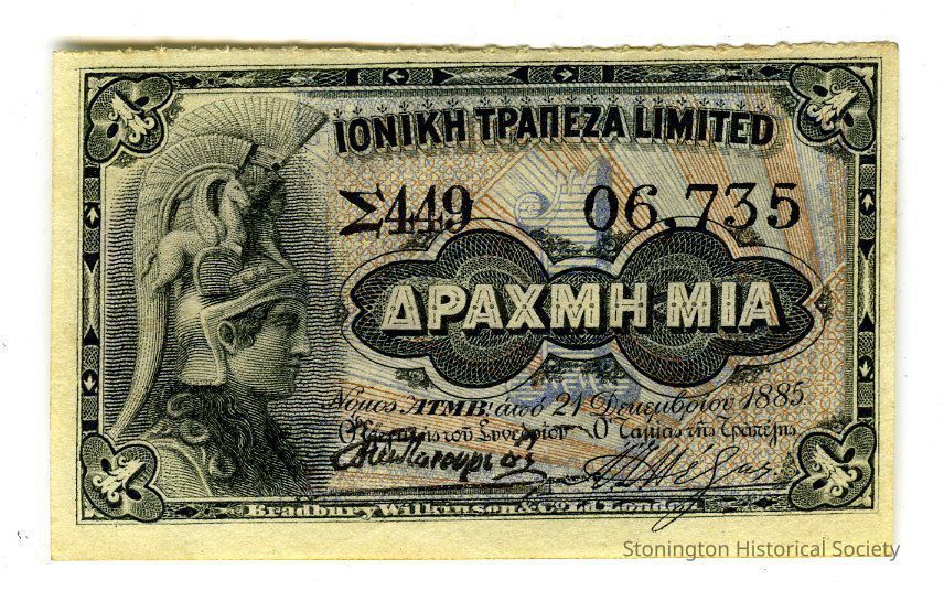 Greek bank note Dated 21 _________ 1885 Printed aby Bradbury Wilkinson & Co. Ltd. London per Dave Barbone, Stonington CT, condition is Almost Unused a/o 5/30/2012