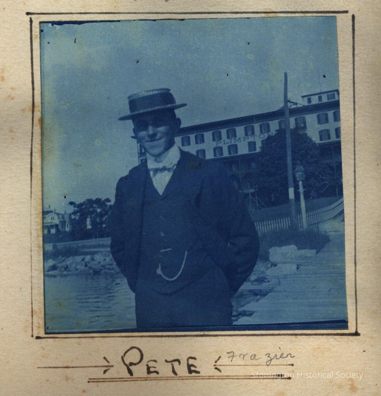 Cyanotype print of Pete Frazier in front of hotel Plimton