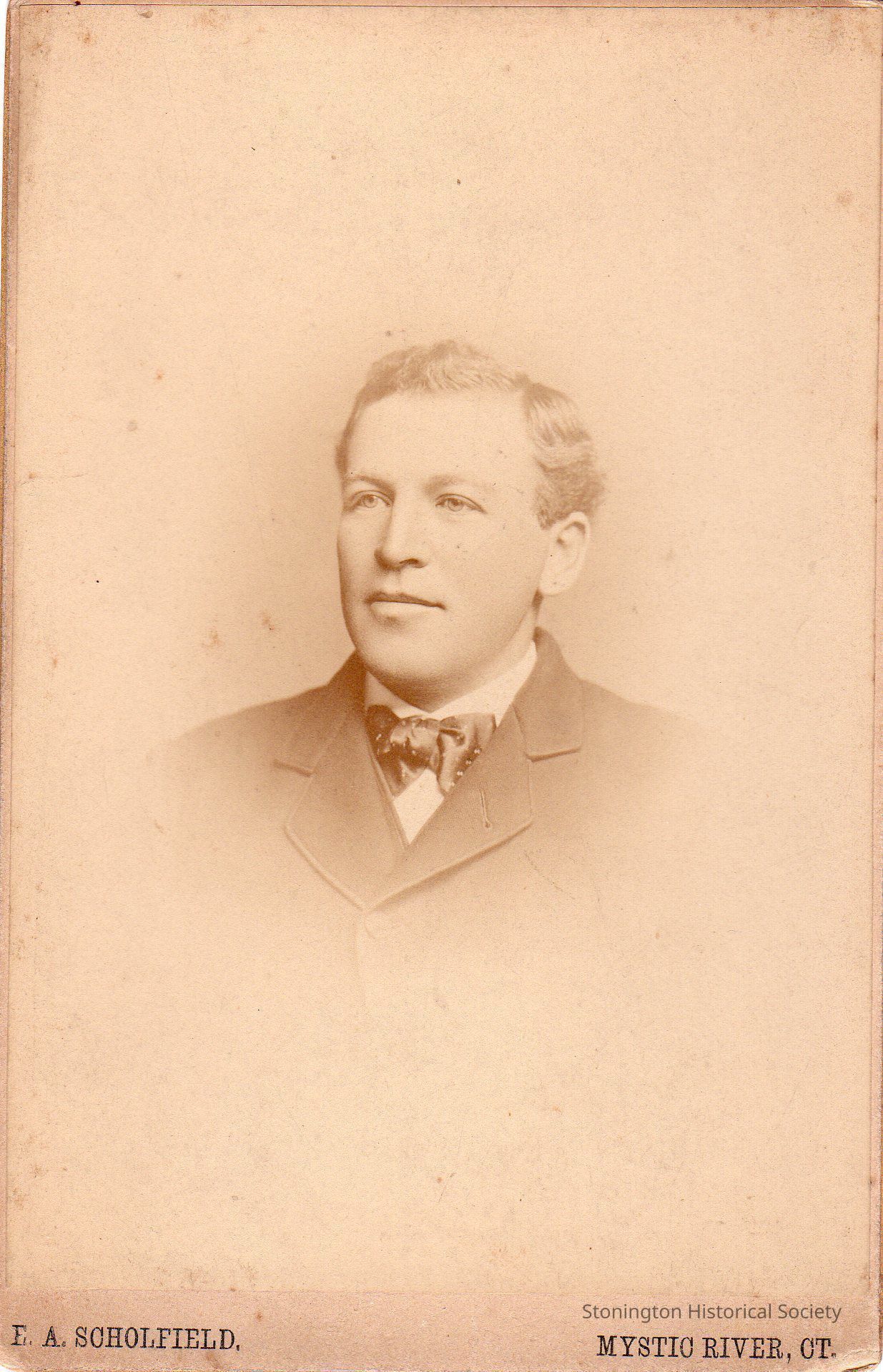 Photograph portrait, mounted on board, of Walter Fish (1854-1908) taken by Everett Scholfield, Mystic. He was the husband of Eunice Fish and lived on Prospect St. in Mystic.Made/Created