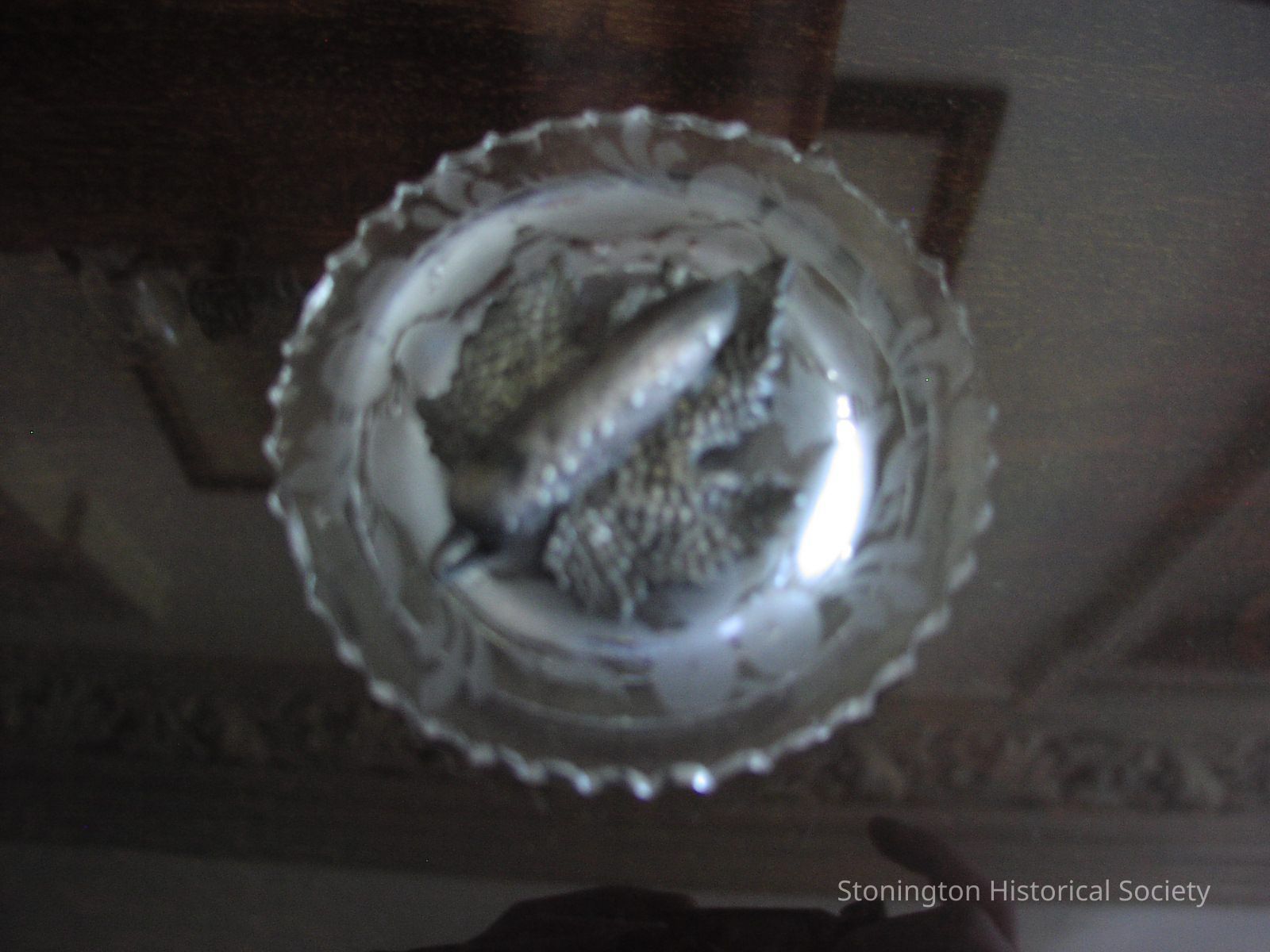 Britannia metal lid for relish jar (PH1989.064.001); cucumber and leaf on lid.