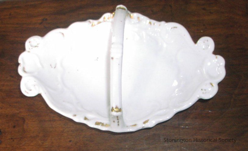 Porcelain candy dish, white with worn gilt; mid-19th century.