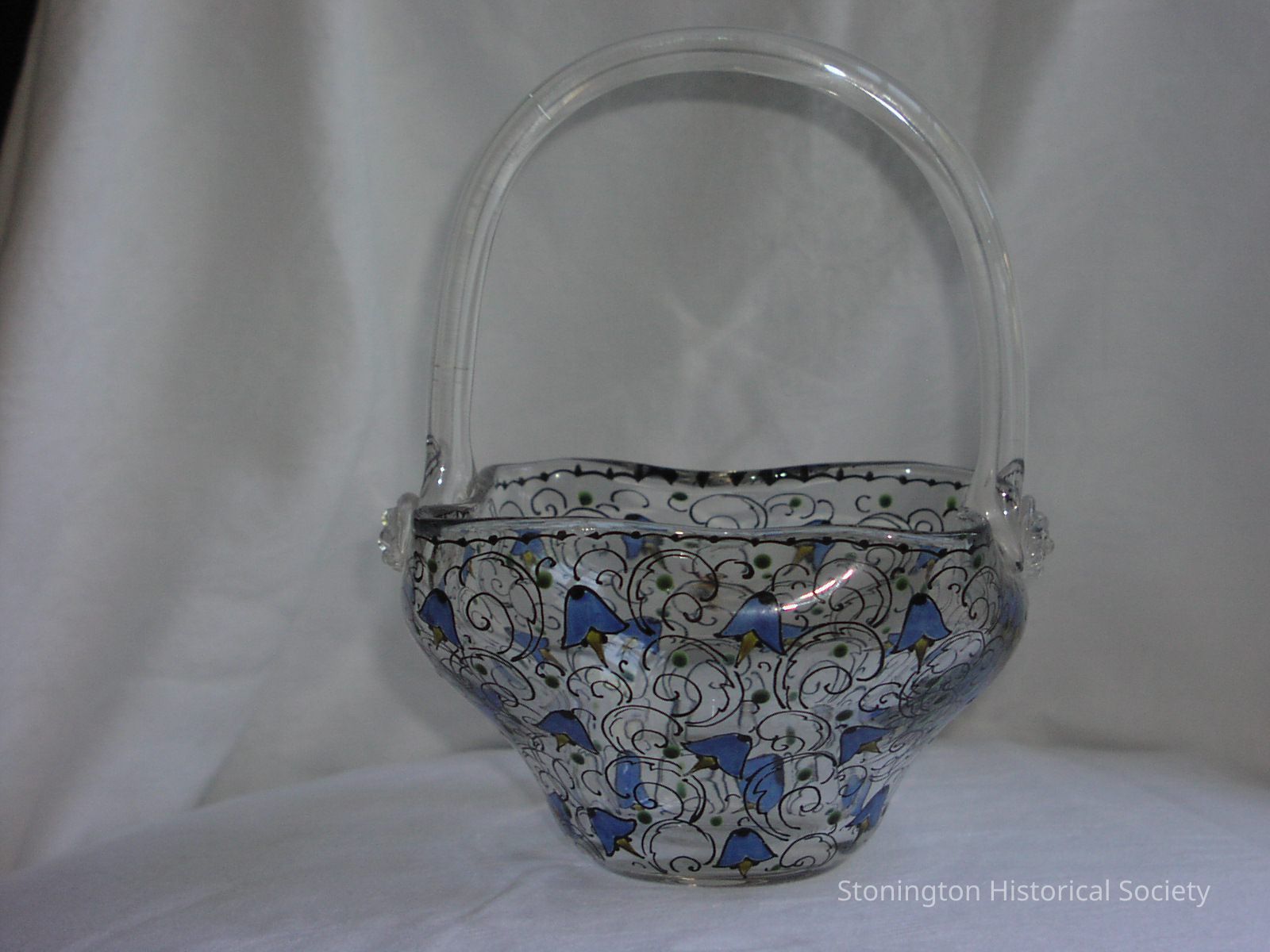 Glass basket; overall design of hand painted bluebell flowers with black acanthus leaves and green dots interspersed; clear glass with clear glass handle, flower at attachment points, clear circular bottom.Collection