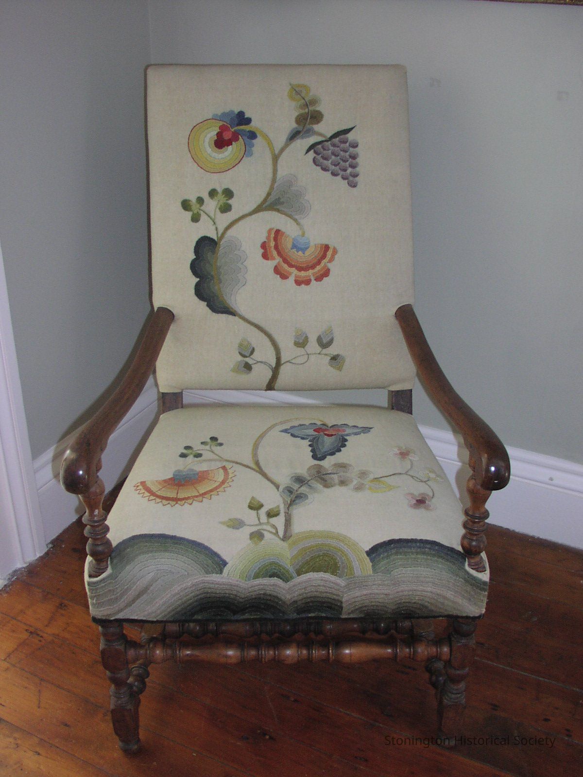 Walnut arm chair with wool upholsterd back and seat, Wiliam & Mary style, 17th century. Crewel embroidery, fustic-dyed yarn, designed by Doris Thacher & embroidered by Vivian Fairbrother in 1950-60 using 18th c. wool sheeting from a house in Norwalk, CT.Collection
