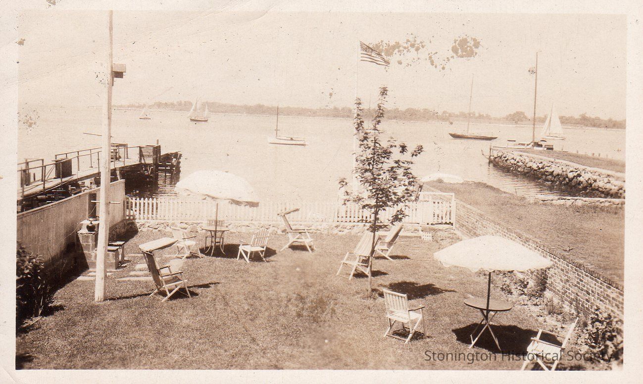 Black and white photograph of the backyard and view of Stonington Harbor from 92 Water Street, c. 1937. From photograph album of Bertha D'Amico with handwritten caption: "Where Fishing Boats and Hearse Met."