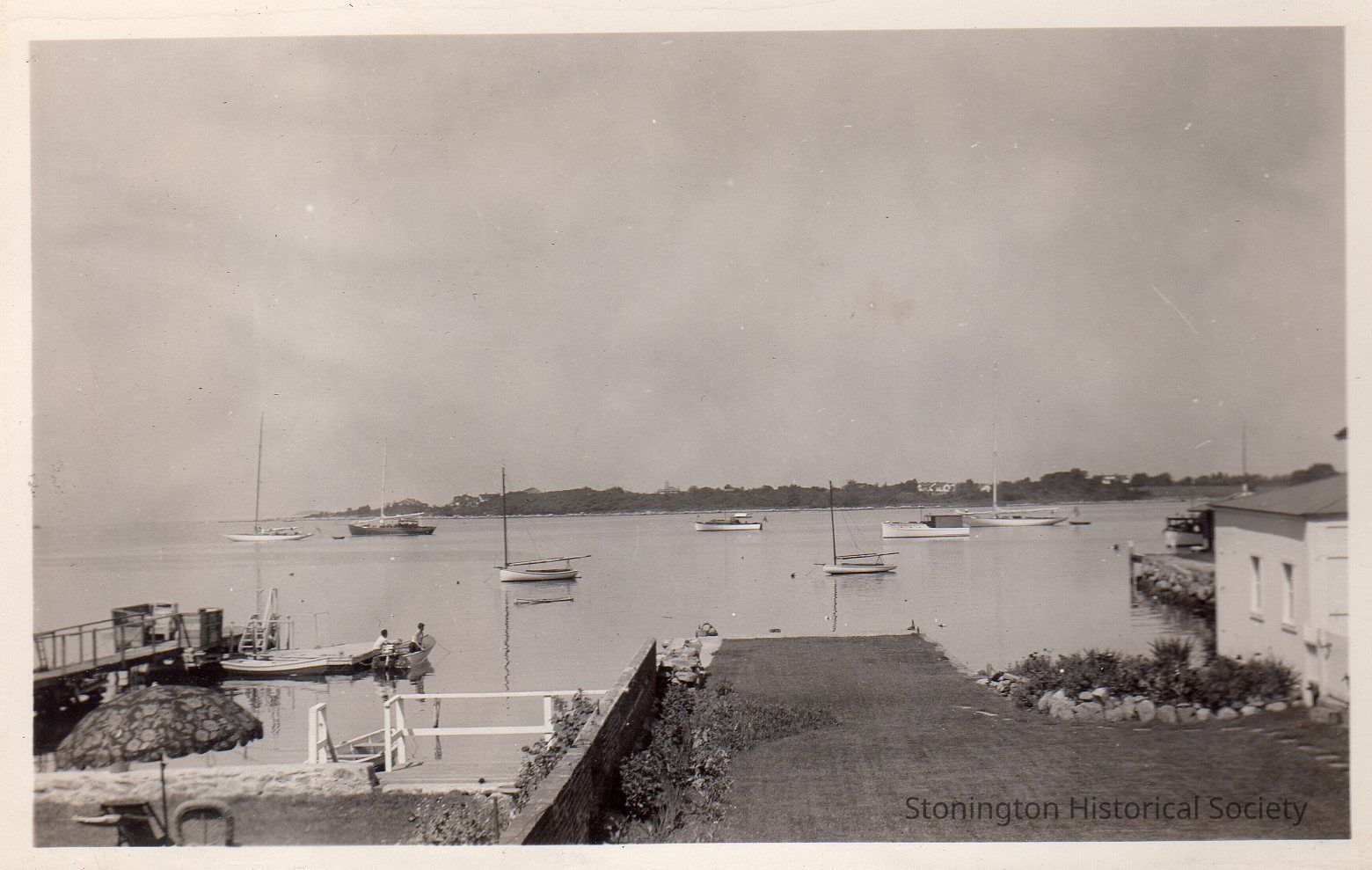 3 black and white photographs of the backyard and Stonington Harbor from 92 Water Street, c. 1937 (before the 1938 Hurricane). From photograph album of Bertha D'Amico.