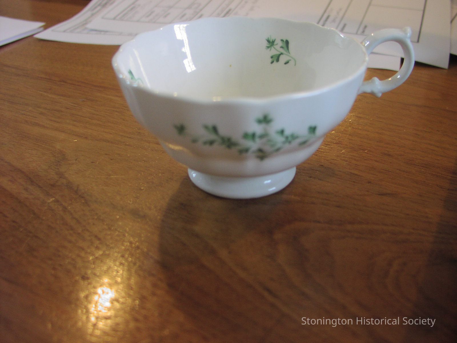 Cup, one of four, white with green sprigs, called "spriggled" by Betsey Denison, original owner.