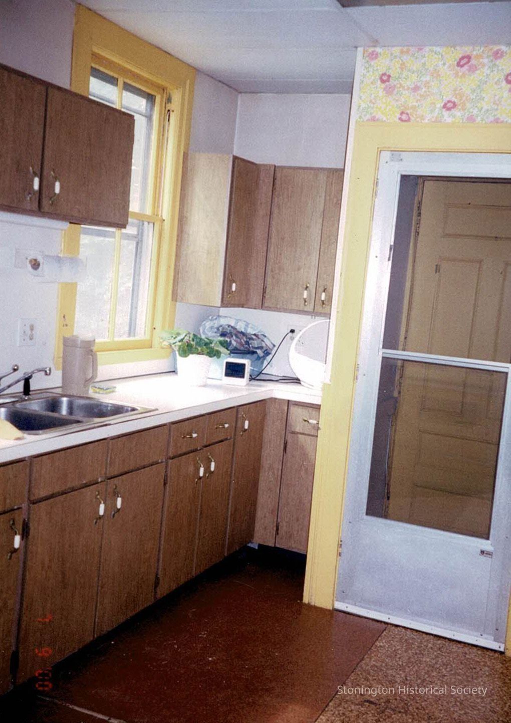 Photograph taken in July of 2000 of the kitchen in Bella Vista, 166 Elm Street, by Rae and Steven Singer after purchasing the property. The home was originally built by Edward E. Bradley around 1901 and features many original architectural and ornamental details. These photographs were taken to document the state of the house before it underwent cosmetic and some structural renovations by the Singers. This view shows the kitchen before major changes were made.Collection