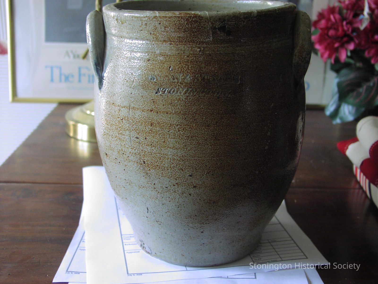 Salt-glazed stoneware ovoid crock, red with tan wash; blue splotches at handles; two handles, flat against sides; wide mouth. "SWAN & STATES STONINGTON" imprinted in clay. Early nineteenth century.Collection