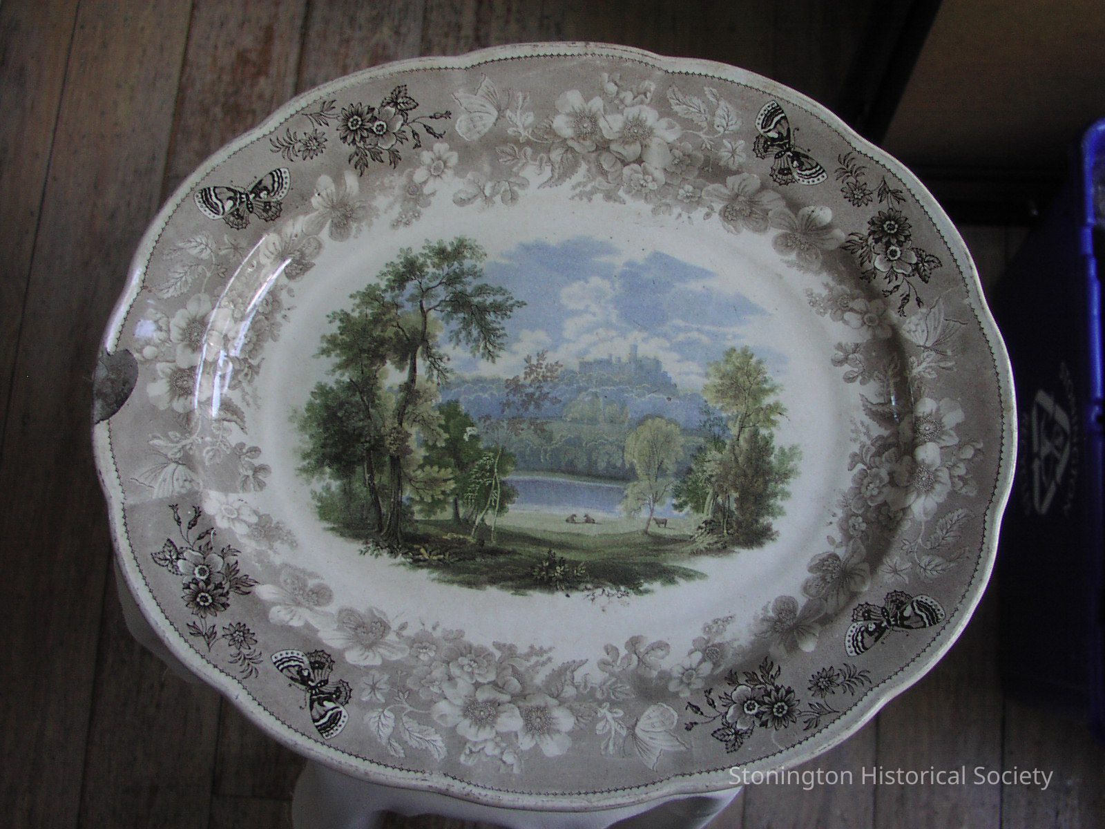 English Staffordshire transferware platter with brown floral border containing butterflies around polychrome scenes of castle on hill lake, cows in meadow.