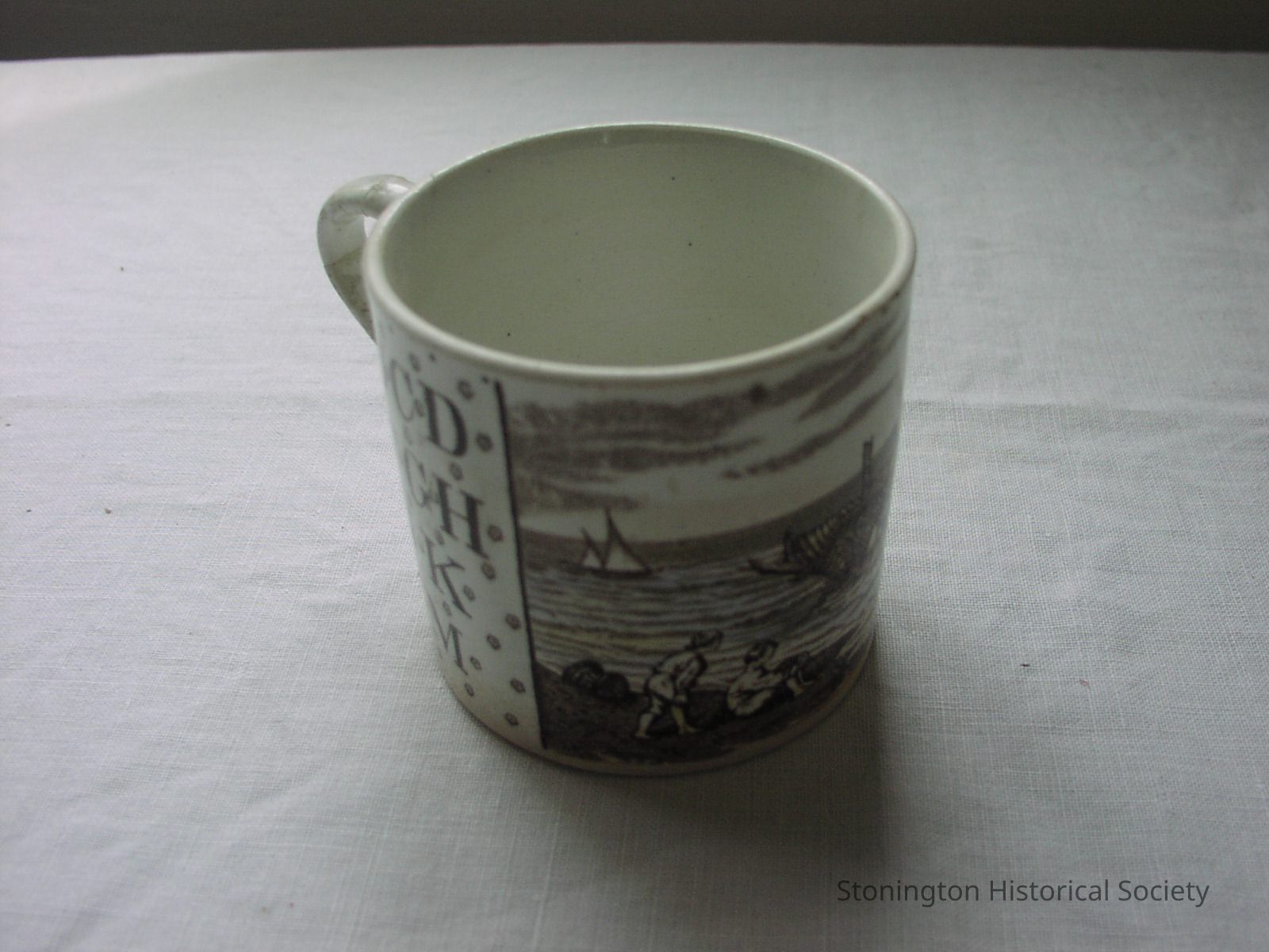 Stoneware? mug, 19th century; brown alphabet, lightly colored seashore scene of two small boys with sailboat and wrecked boat hull. Maker's mark on botton features the letter R.